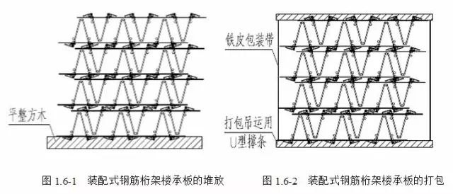 ③ 露天存放時,鋼筋桁架必須采取防止產(chǎn)品生銹的措施;模板應下墊方木、邊角對齊堆放在平整的地面上,板面不得與地面接觸。材料長期存貯,要保持通風良好,防止日曬雨淋,并定期檢查。有條件時應蓋防水布。