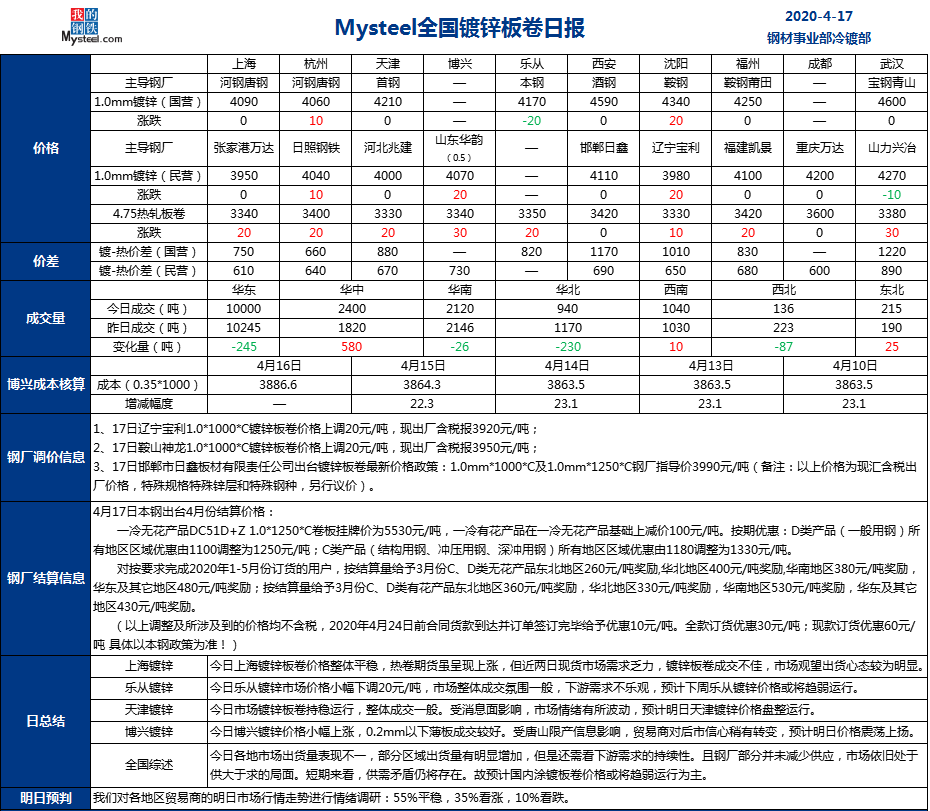 2020年4月17日鍍鋅板卷指數(shù)為85.69與昨日持平。價格方面,截至發(fā)稿,1.0mm鍍鋅板卷平均價格為4285元/噸,較上一個交易日上漲4元/噸。市場方面,博興、沈陽等地區(qū)鍍鋅板卷價格小幅反彈,在唐山限產(chǎn)事件的發(fā)酵下,部分城市經(jīng)銷商情緒面出現(xiàn)一定的改觀,存在看漲情緒。多數(shù)城市經(jīng)銷商考慮到當(dāng)前市場庫存仍處于同期高位,則是選擇靜觀其變,等待具體減產(chǎn)文件出臺。
