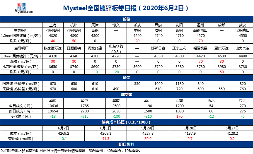 我的鋼鐵網(wǎng)訊:2日鍍鋅板卷指數(shù)為88.38,較昨日上漲0.36%。截至發(fā)稿,1.0mm鍍鋅板卷平均價(jià)格為4486元/噸,較上一個(gè)交易日上漲11元/噸。本周各地市場(chǎng)鍍鋅價(jià)格漲勢(shì)較為兇猛,一方面,月初各大鋼廠出臺(tái)上旬調(diào)價(jià),基本呈現(xiàn)上揚(yáng);