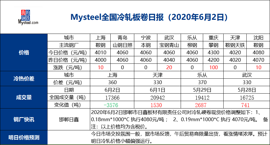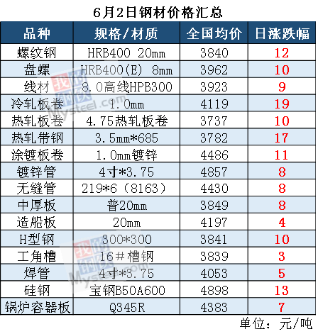 截至6月2日17:00,螺紋鋼(3639, 31.00, 0.86%) HRB400 20mm全國(guó)均價(jià)3840元/噸,漲12元/噸;線材 8.0高線 HPB300全國(guó)均價(jià)3923元/噸,漲9元/噸;冷軋板卷 1.0mm 全國(guó)均價(jià)4119元/噸,漲19元/噸。