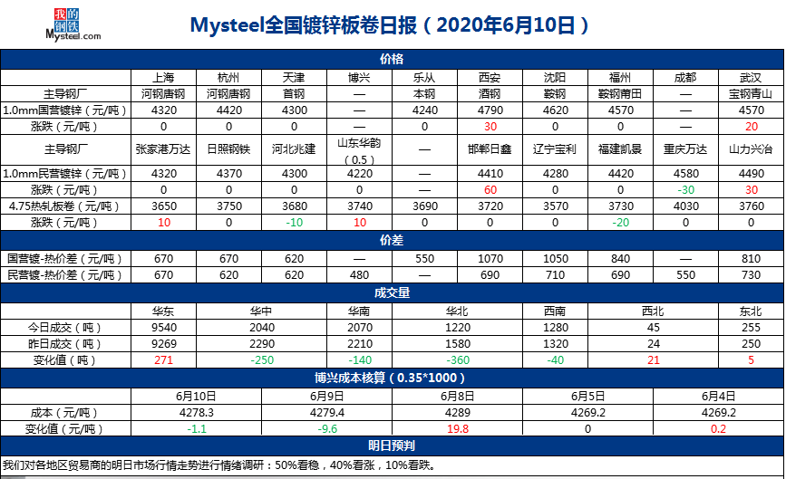我的鋼鐵網(wǎng)訊:10日鍍鋅板卷指數(shù)為88.46,與上一個交易日持平。截至發(fā)稿,1.0mm鍍鋅板卷平均價格為4500元/噸,較上一個交易日上漲1元/噸。市場方面,鋼廠紛紛上調(diào)7月份期貨價格政策250元/噸以上,貿(mào)易商訂貨成本較高,挺價意愿較強。