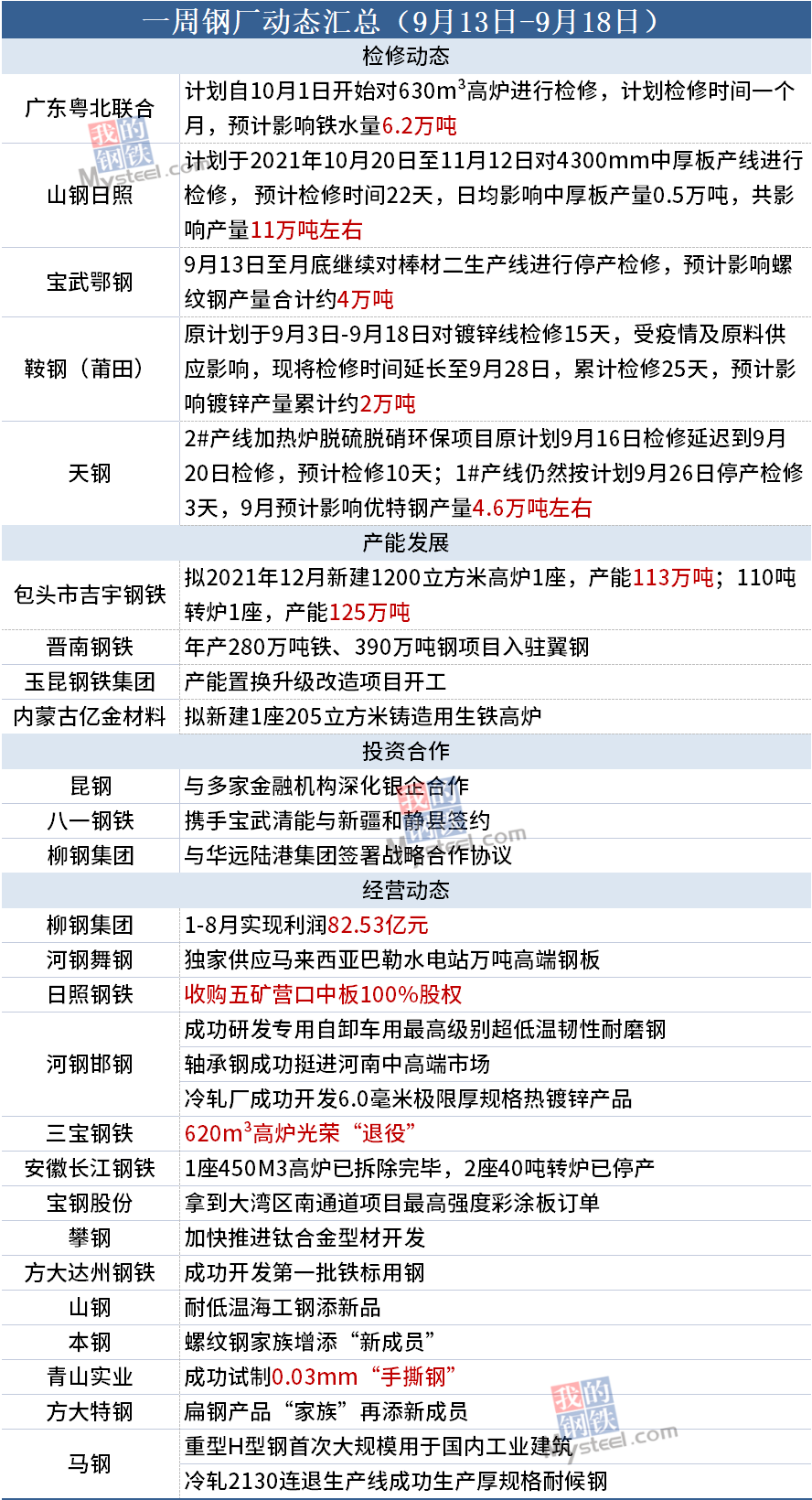 據(jù)Mysteel不完全統(tǒng)計(jì),本周(2021年9月13日-9月18日)有5家鋼廠發(fā)布檢修動(dòng)態(tài)
