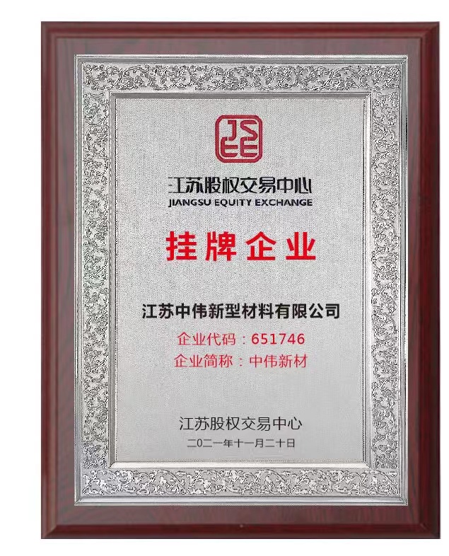 2021年11月20日 ,江蘇中偉新型材料有限公司在江蘇股權交易中心掛牌成立,標志著江蘇中偉新材在走向國際化、專業(yè)化的道路上邁出了跨越性的一步。